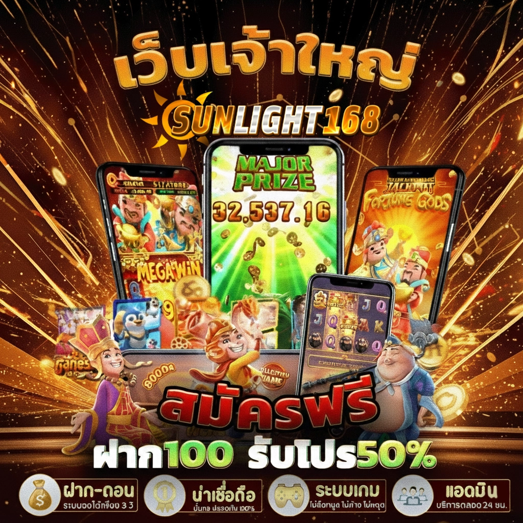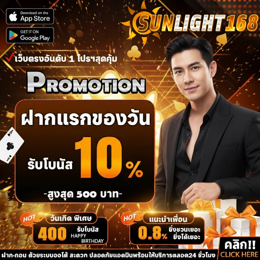 ถ้าคุณกำลังมองหาเว็บพนันออนไลน์ที่มีโปรโมชั่นสุดคุ้มสำหรับสมาชิกใหม่ SUNLIGHT168 คือคำตอบที่ดีที่สุด เพราะที่นี่มีข้อเสนอสุดพิเศษที่จะทำให้การเดิมพันของคุณสนุกและคุ้มค่ามากยิ่งขึ้น เริ่มต้นด้วยโบนัสต้อนรับสมาชิกใหม่สูงถึง 100% ซึ่งหมายความว่าเมื่อคุณฝากเงินครั้งแรก คุณจะได้รับเงินเพิ่มเป็นสองเท่าทันที ยกตัวอย่างเช่น ถ้าคุณฝาก 1,000 บาท คุณจะได้เครดิตเพิ่มอีก 1,000 บาท รวมเป็น 2,000 บาทที่พร้อมใช้เดิมพัน